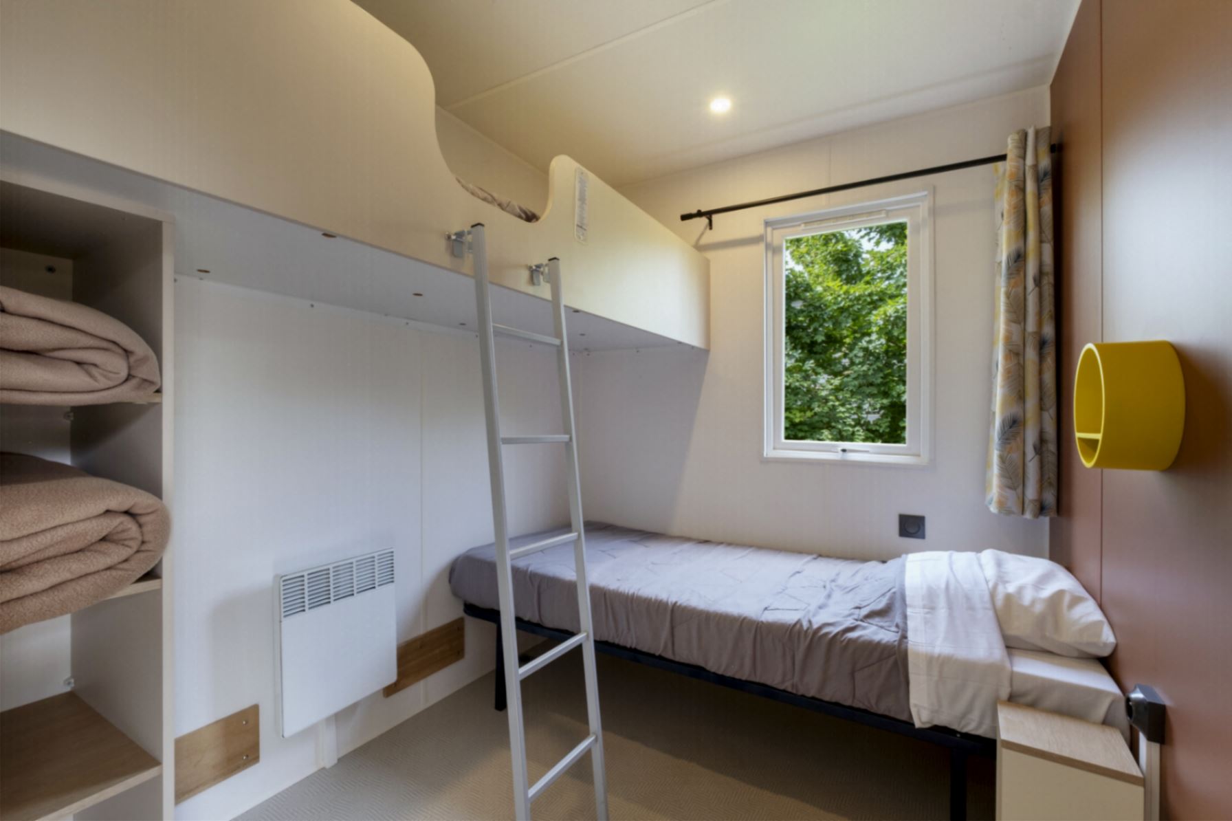 Coin nuit : une chambre avec 1 lit double (140×190), une chambre avec 2 lits simples (80×190), côte à côte ou superposés, oreillers et couettes fournis.