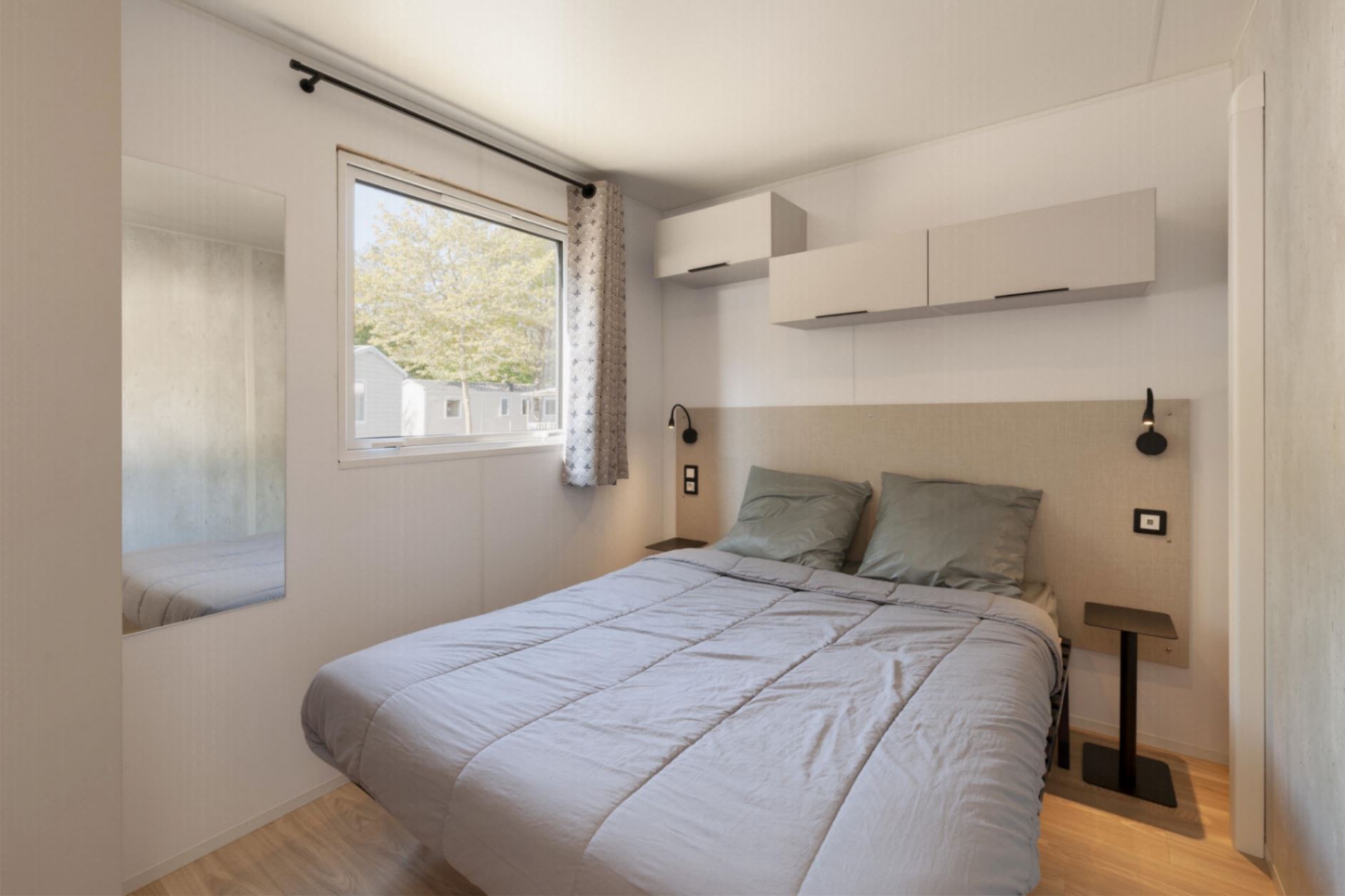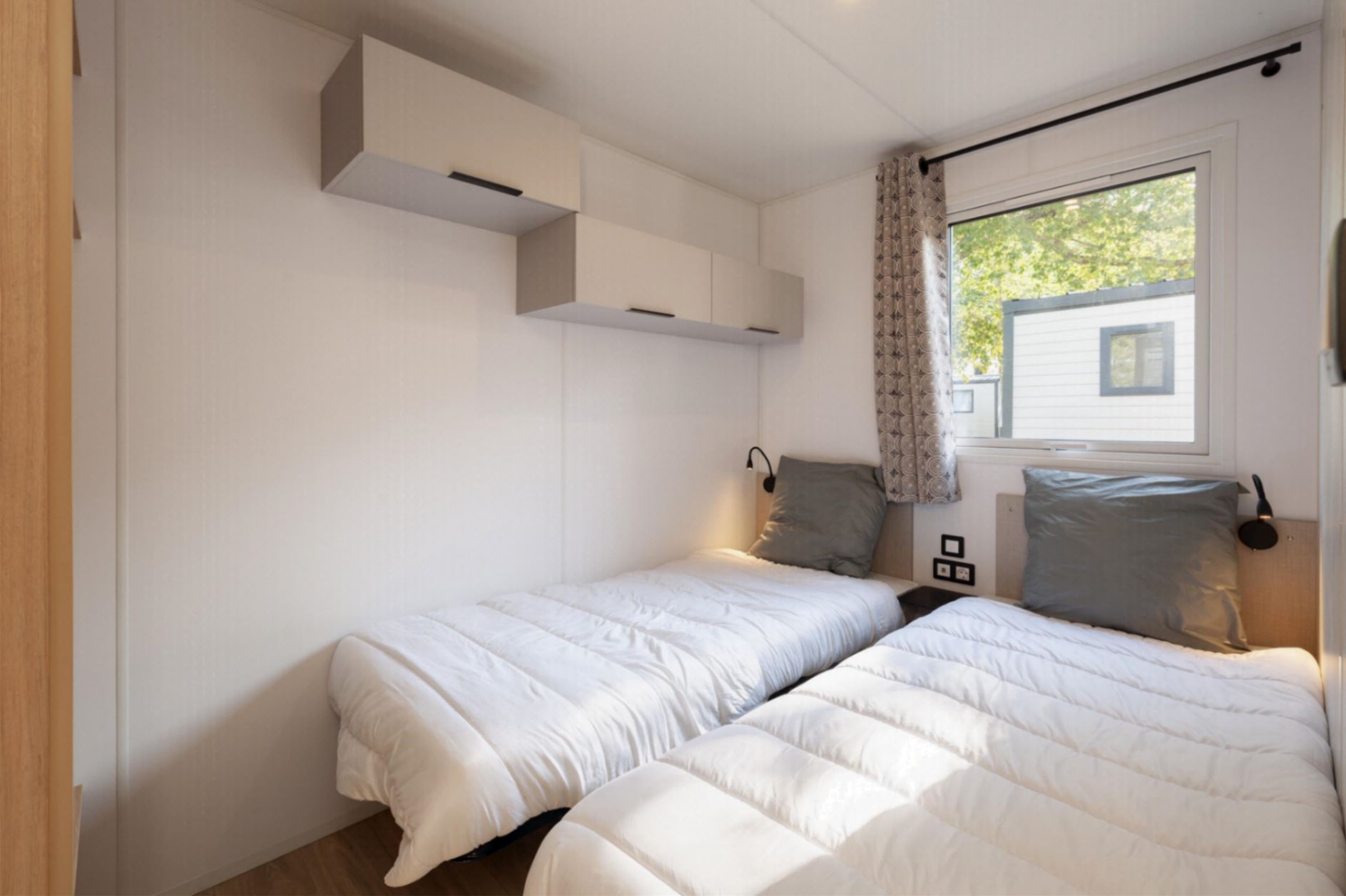 Coin nuit : une chambre avec 1 lit double (140×190), une chambre avec 2 lits simples (80×190), côte à côte, oreillers et couettes fournis.