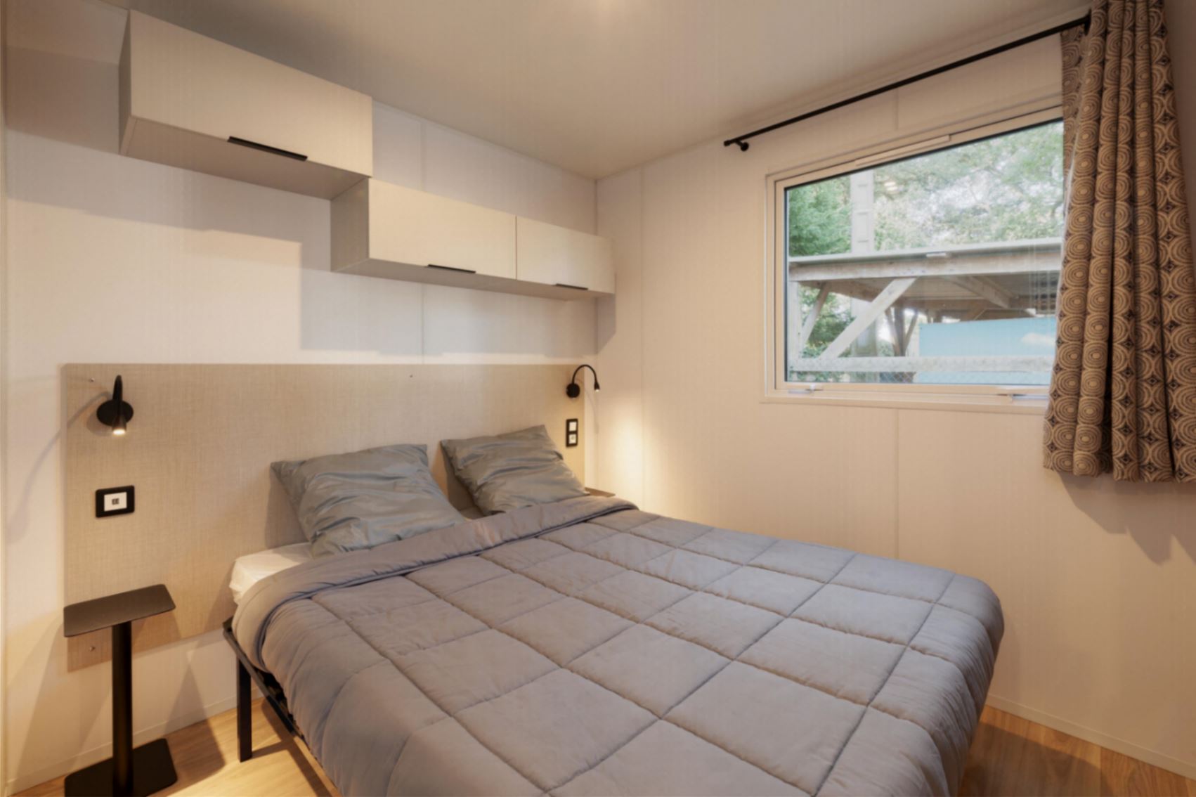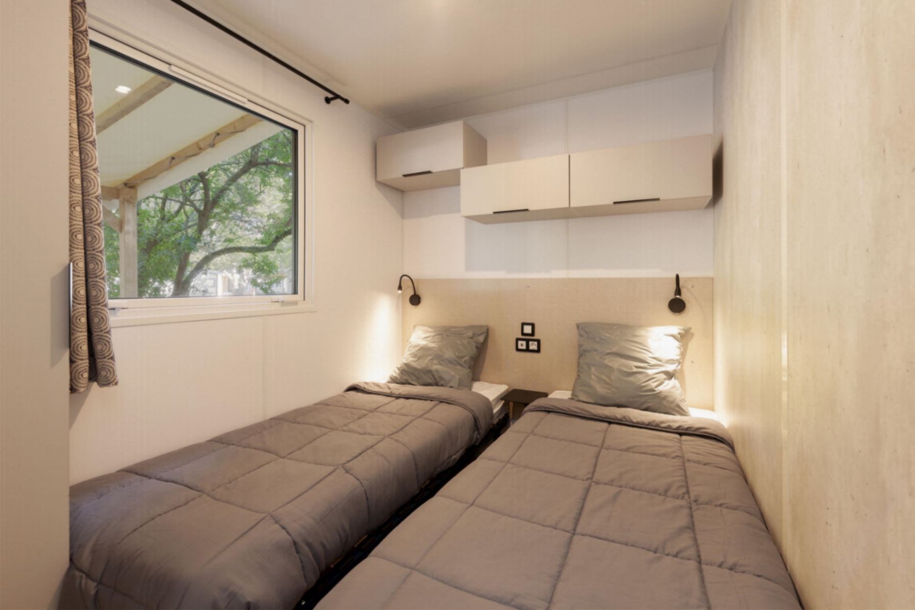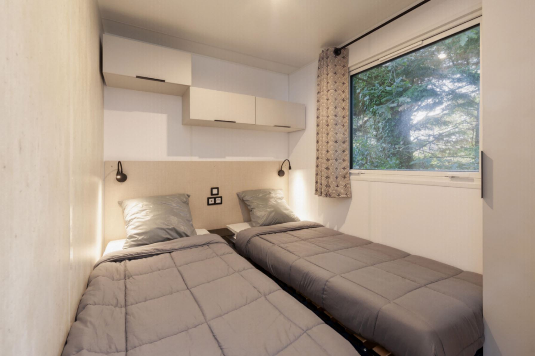 Coin nuit : une chambre avec 1 lit double (140×190), deux chambres avec 2 lits simples (80×190), côte à côte, oreillers et couettes fournis.