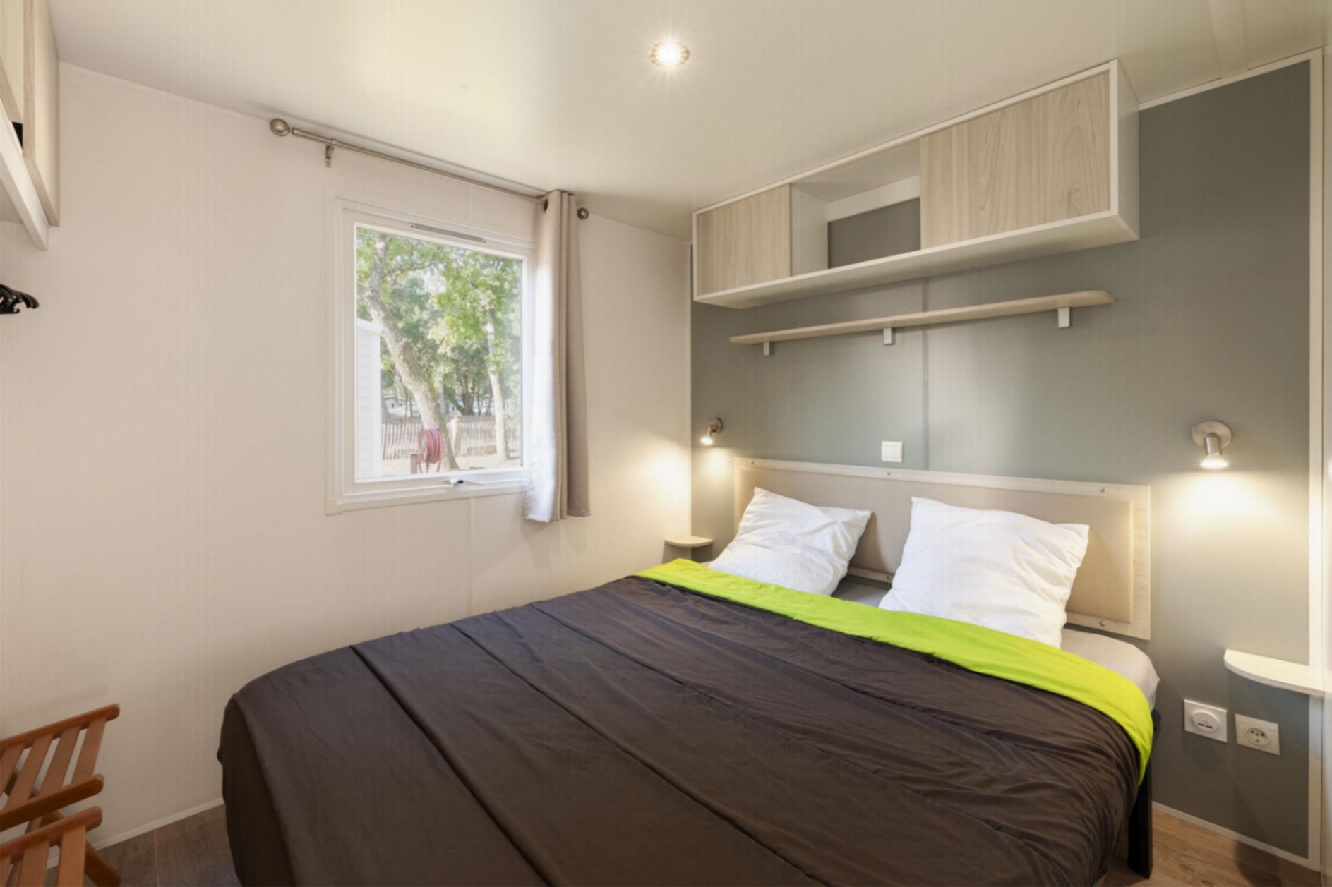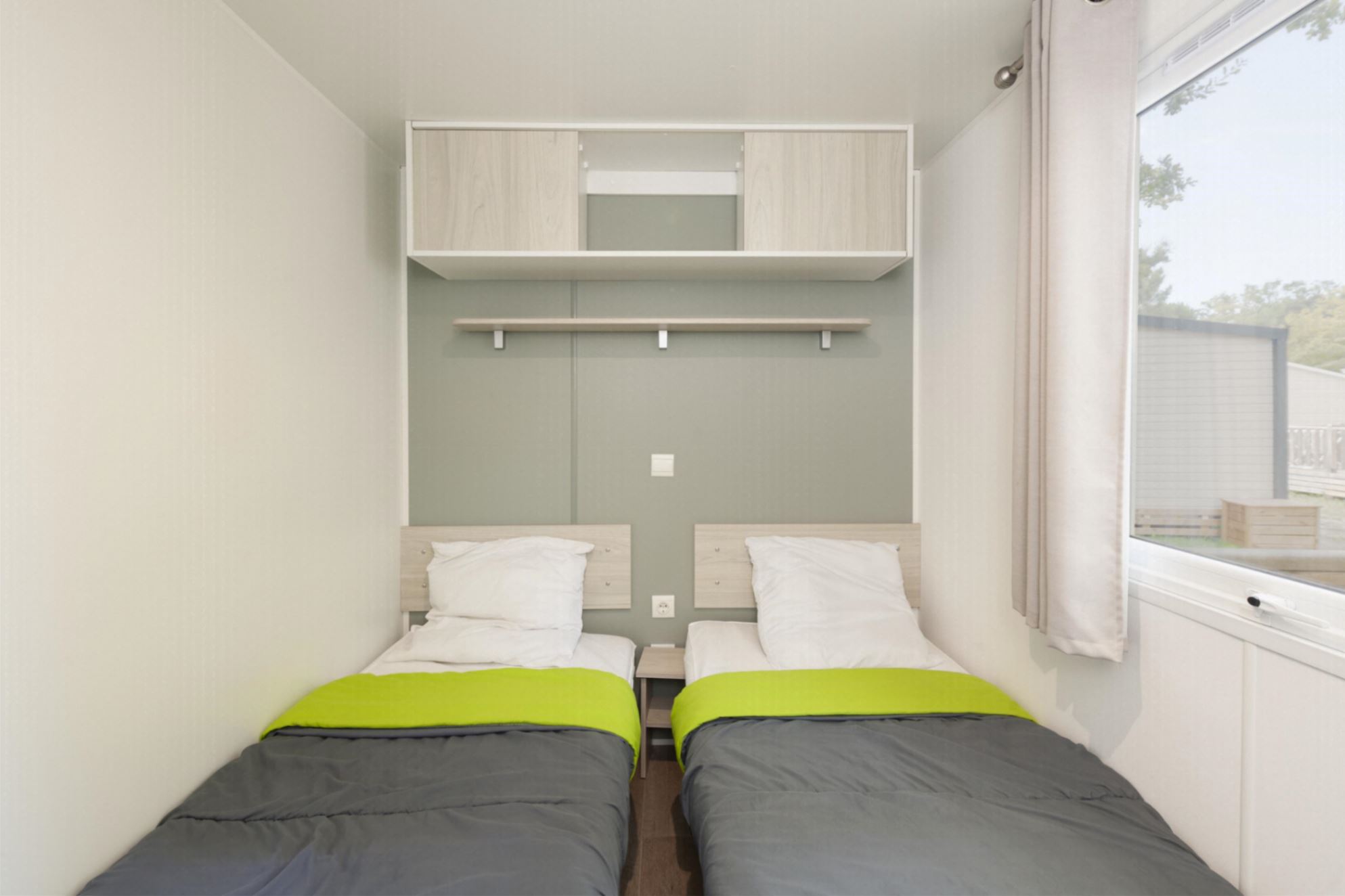Coin nuit : une chambre avec 1 lit double (160×190), une chambre avec 2 lits simples (80×190), côte à côte, oreillers et couettes fournis.