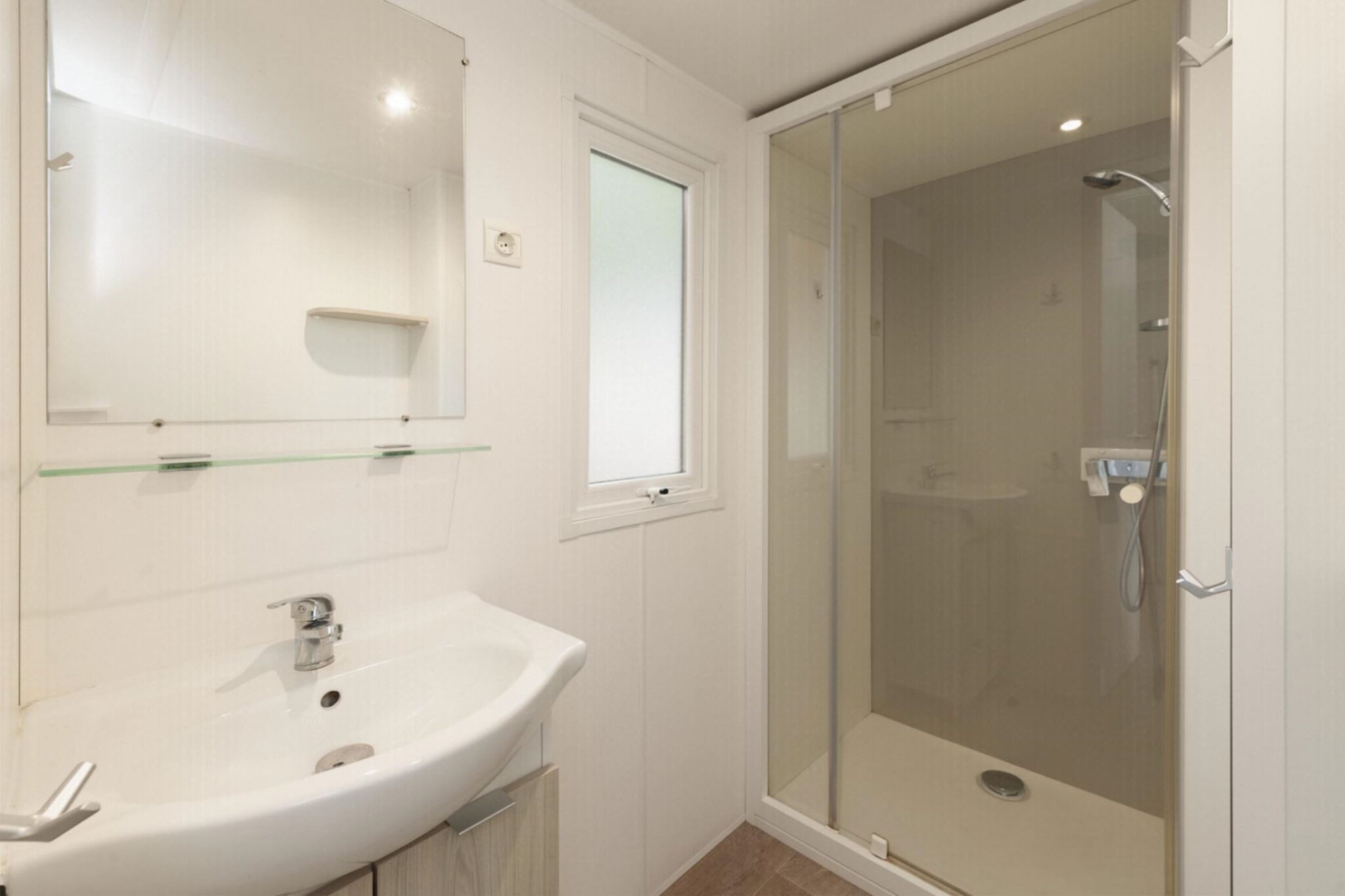 Sanitaire : salle d’eau avec douche et lavabo, WC séparé.